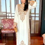 Ivory Muslin drapes fluidly from shoulder to ankle in this floor-grazing kaftan, anchored by a plunging Mughal neckline. Intricately embroidered slits finished with delicate cutwork add depth and dimension. The silhouette is signature to the brand—timeless, versatile, and made to transcend seasons.